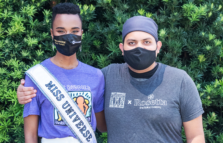 Zozibini Tunzi, a big supporter of the nonprofit Best Buddies, made a stop at the Best Buddies x Rosetta Italian Bakery in Brickell, Miami, Florida.